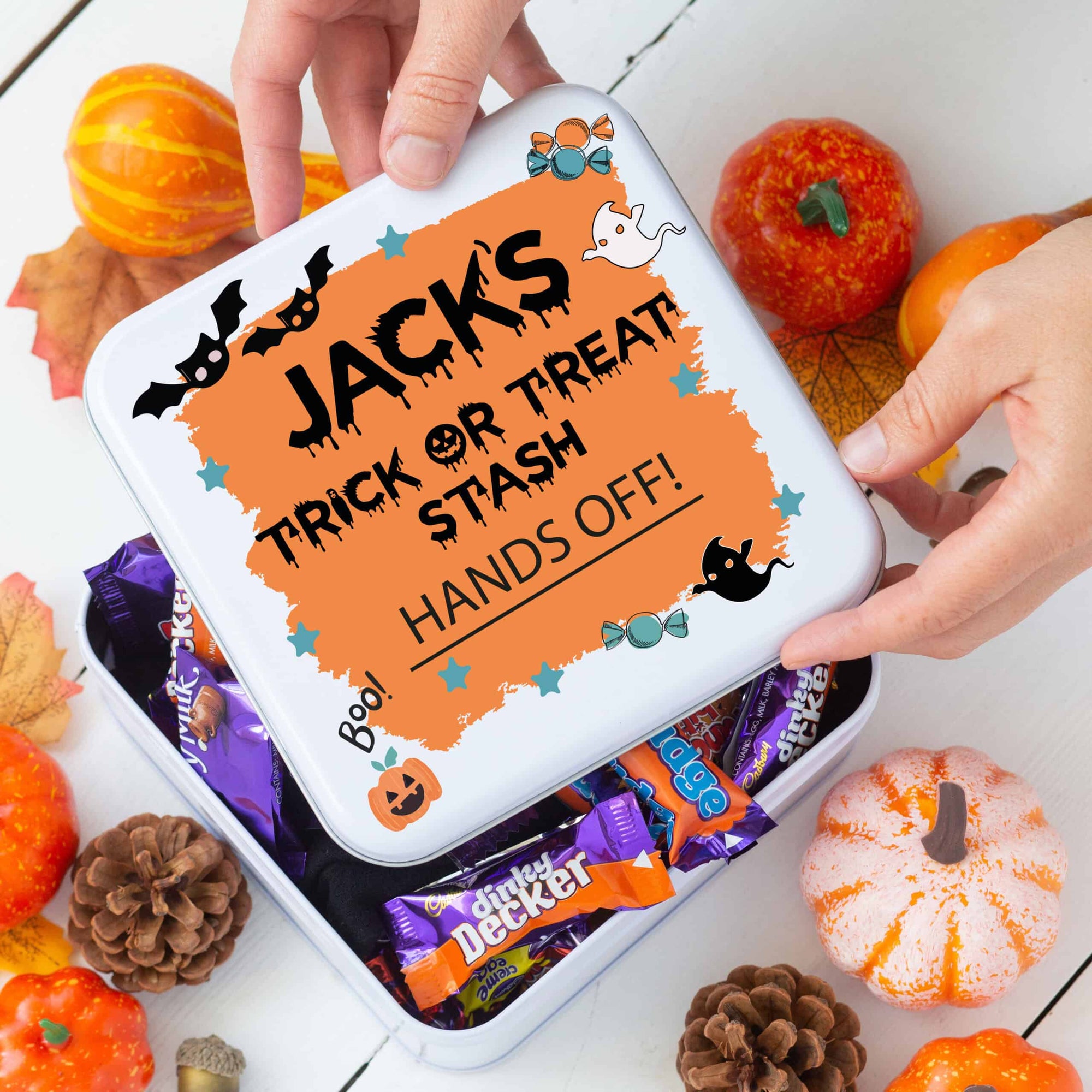 The white sweetie tin is professionally printed with any name, adding to the excitement of 31st October!, Hallows Eve! The colourful halloween design is printed and not stickers, meaning it's durable and long lasting, ready to bring out every halloween for years to come!