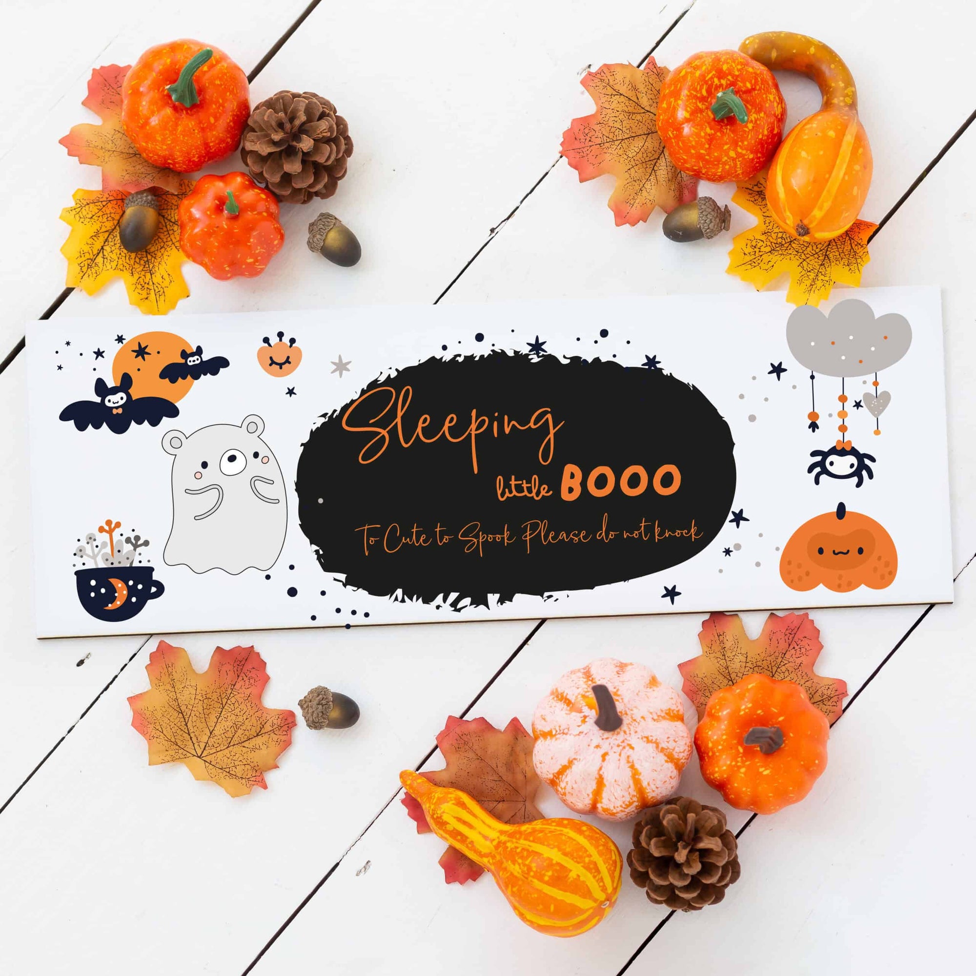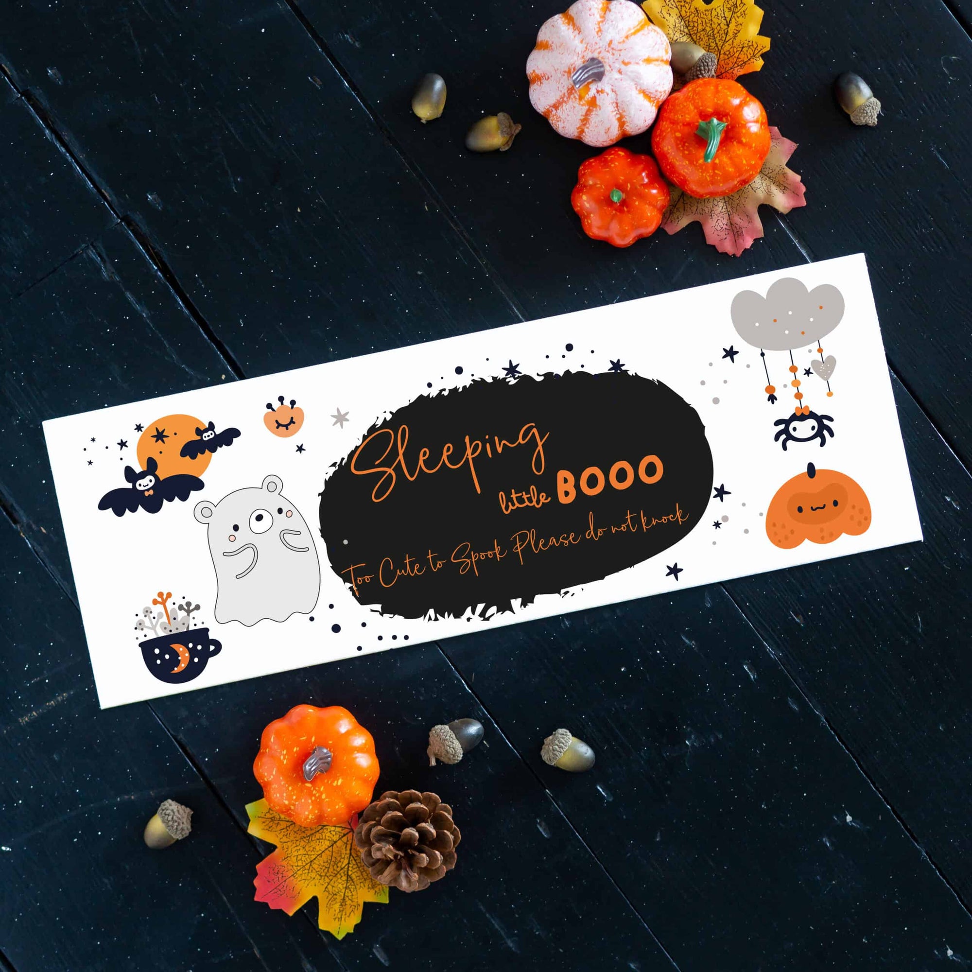 The top 'Sleeping Little' and bottom 'To Cute To Spook Please Do Not Knock' lines of text are fixed and cannot be changed. Please provide us with a name to be printed on the middle line. Eg the listing photo features 'Booo' as the personalisation.