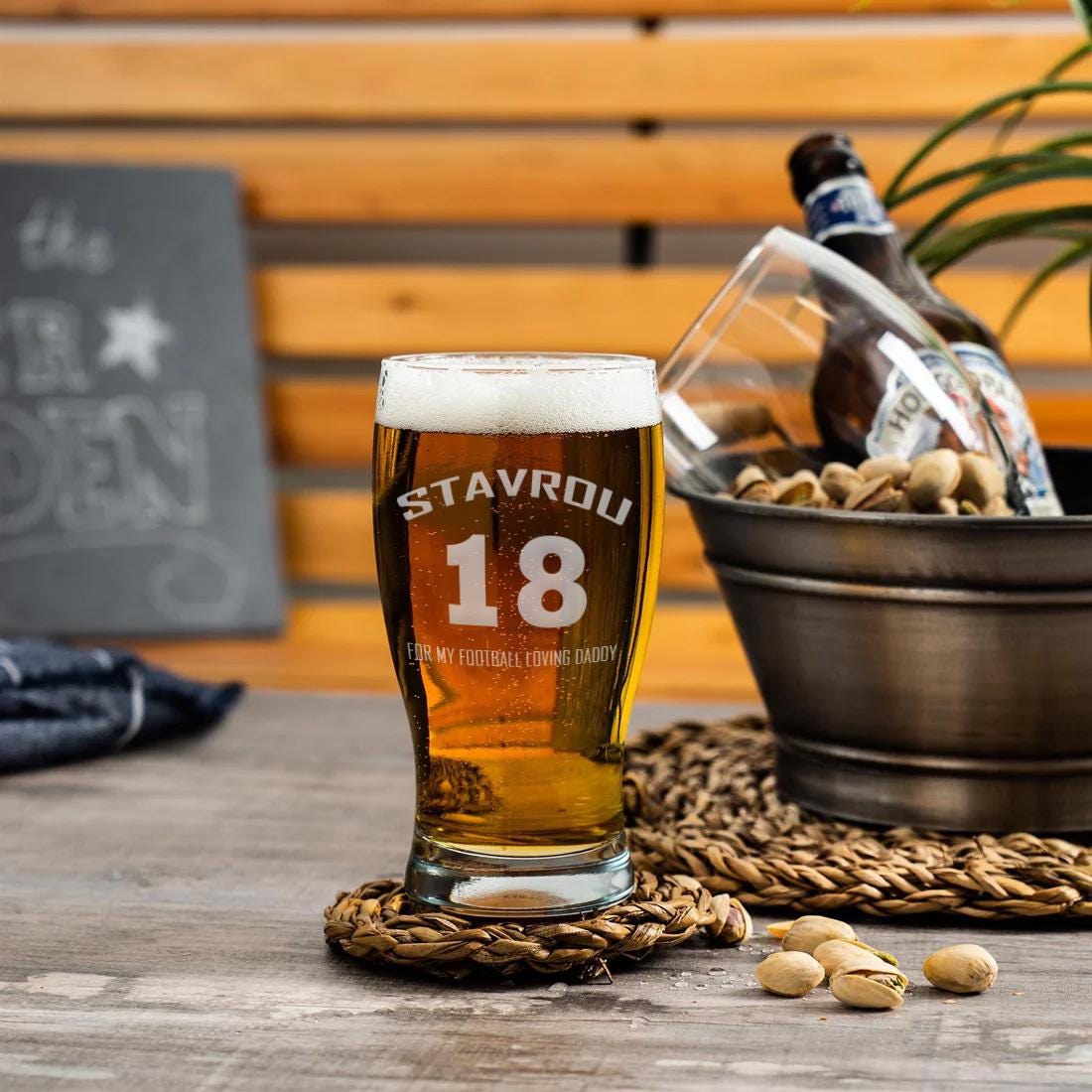 Personalised Father's Day Football T Shirt Name Engraved Pint Glass